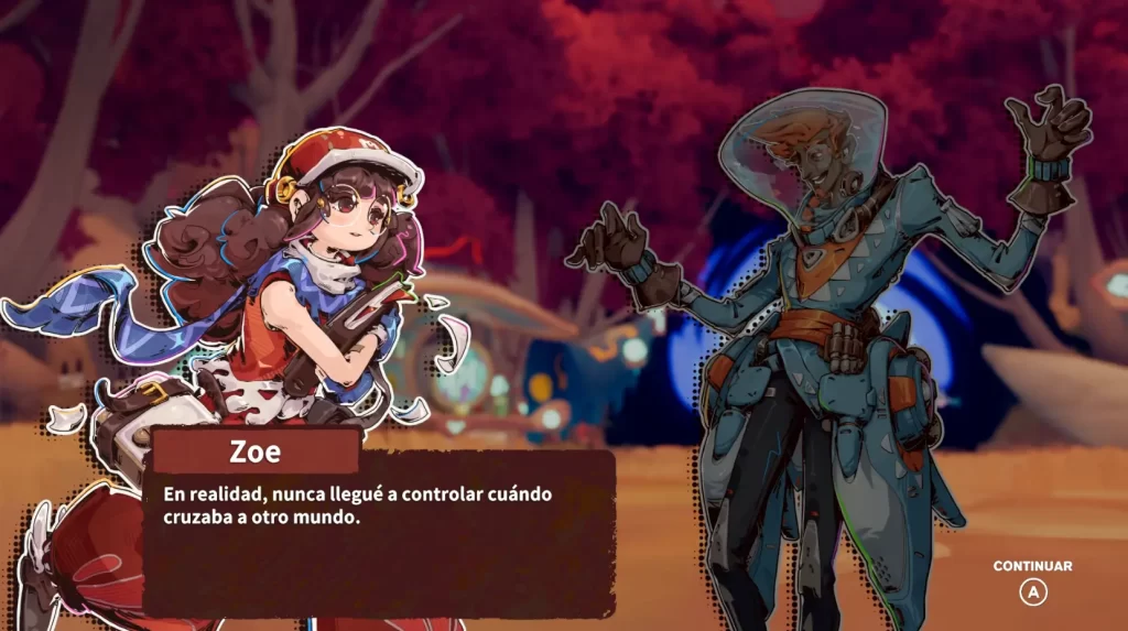 Antes de entrar a cualquier Esquirla está el mundo “principal”, por decirlo así. Aquí ves estadísticas, checas tus objetos desbloqueados, compras upgrades para Zoe, mejoras tus stats… y lo mejor de todo: ¡puedes cambiarle el atuendo! Y no solo es cosmético en el menú, también se refleja dentro del juego y en el retrato cuando Zoe platica. Se agradece ese detalle, porque uno siempre quiere que el personaje corra a toda madre, pero con estilo.