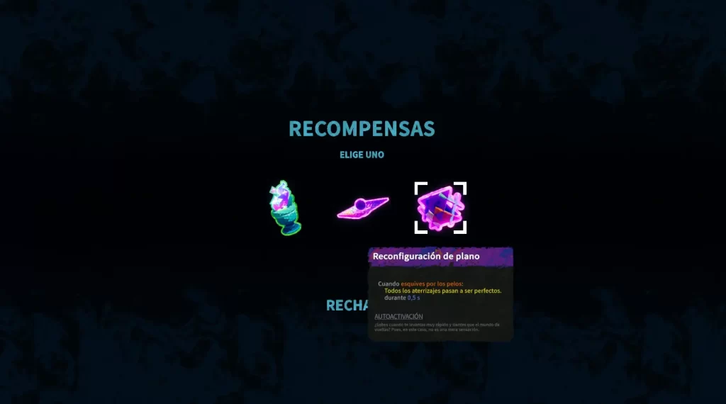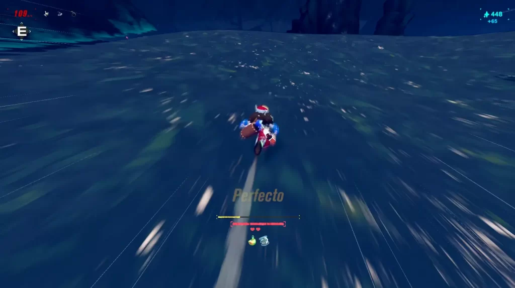 Hablando de mejoras, también puedes equiparte cosillas antes de entrar a las Esquirlas: desde una tabla futurista que te da más velocidad, hasta una capa que te deja planear más alto. Todo eso consume energía, la cual se recarga con objetos o con aterrizajes perfectos. Así que administra bien, carnal, porque si te emocionas gastando, te quedas sin gota y… sí, otra vez, te petateas.
