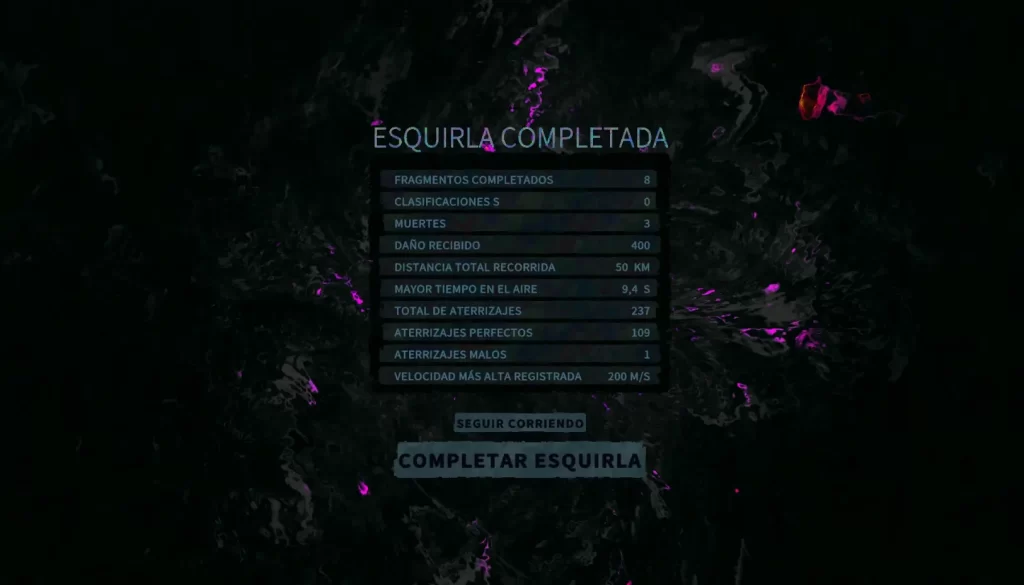 Hay cuatro niveles de aterrizaje: Perfecto, Bien, Aceptable y Malísimo. Y créeme, cuando caes mal, no es un “uy, me tropecé”, es un gacho madrazo. Es tan difícil recuperarte que a veces es más fácil aceptar la derrota y reiniciar. En cambio, clavar un Perfecto es una delicia: velocidad extra, impulso y la satisfacción de sentirte speedrunner aunque en realidad solo estés sobreviviendo por inercia. Porque sí, si la destrucción te alcanza… adiós Zoe, te petateas en cámara lenta.